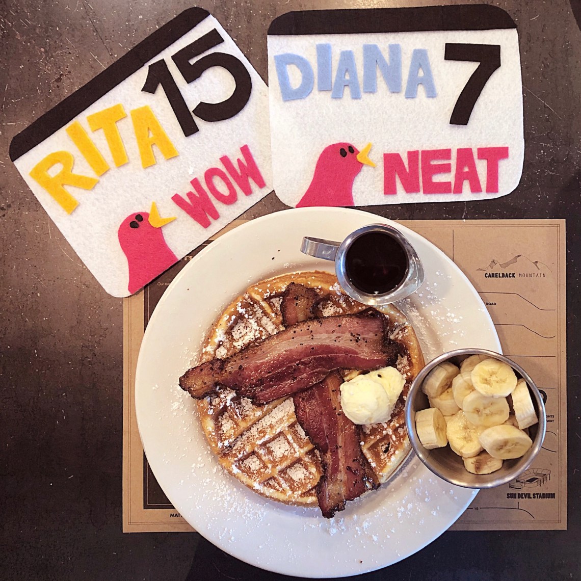 But when my brother Jack mentioned the idea of a Just Me (Just Us?) 5K, we thought WHY NOT?! We’d keep our activity level high, be able to eat even more things, and see a bit of Phoenix. Plus, he made us rad race bibs (see pic below.)